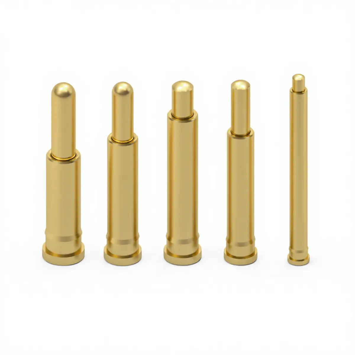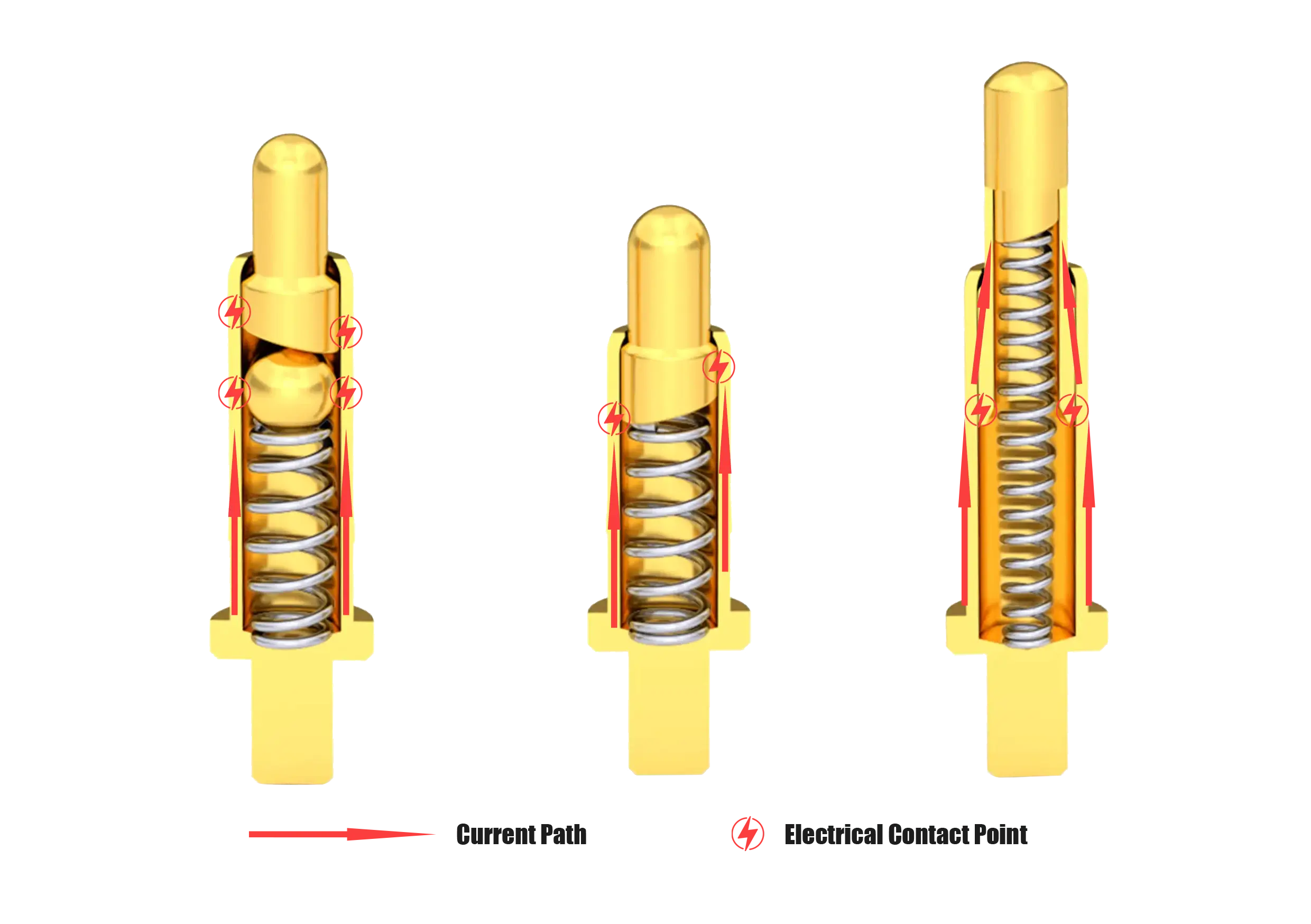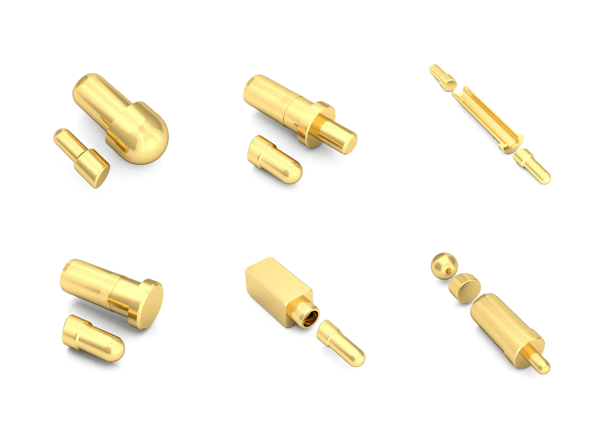 Internally each pin slides within a precision machined barrel and is guided by small clearances and features that keep the plunger centered. The compression spring sits between the barrel and plunger, providing a controlled contact force through the working stroke. Manufacturers use several internal geometries simple bevels, ball tip or copper ball interfaces, and inner hole guide features to reduce friction, stabilize lateral movement, and improve electrical contact area. Some multi part designs add a spacer or locking element to increase current capacity and durability. Tight machining tolerances, quality plating, and spring selection determine friction, wear, and consistent resistance over many cycles.