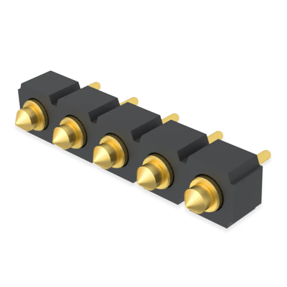 5 point pogo pin connector is a high performance spring loaded interface featuring a cluster of multiple independent contact probes housed in a precision molded frame. Each contact comprises a plunger, an internal spring, and a sturdy barrel, providing a flexible connection that absorbs mechanical tolerances and vibrations. These connectors are widely used for data syncing and power charging in smart wearables, medical devices, and industrial equipment. By utilizing vertical compression instead of traditional sliding friction, they ensure a long lasting, reliable connection that withstands thousands of mating cycles without compromising electrical integrity or physical stability.
