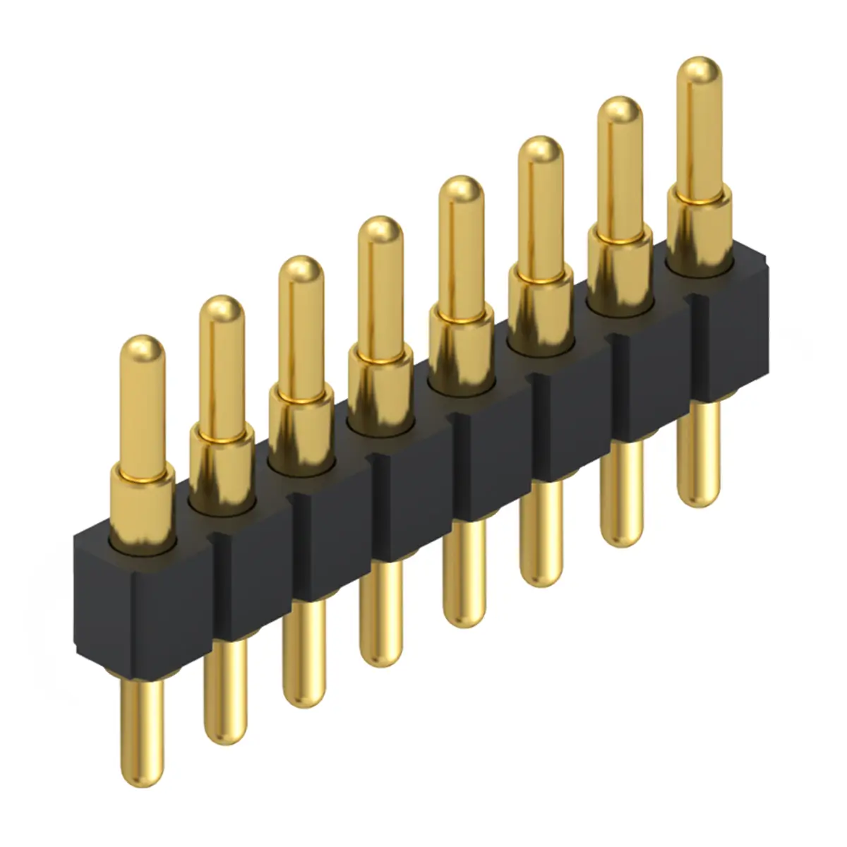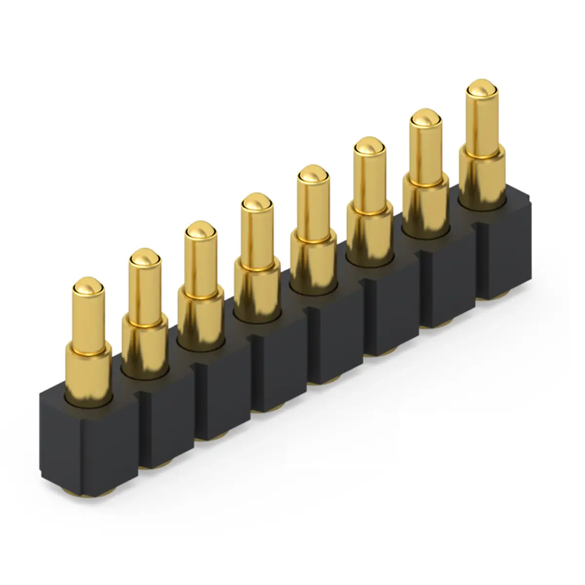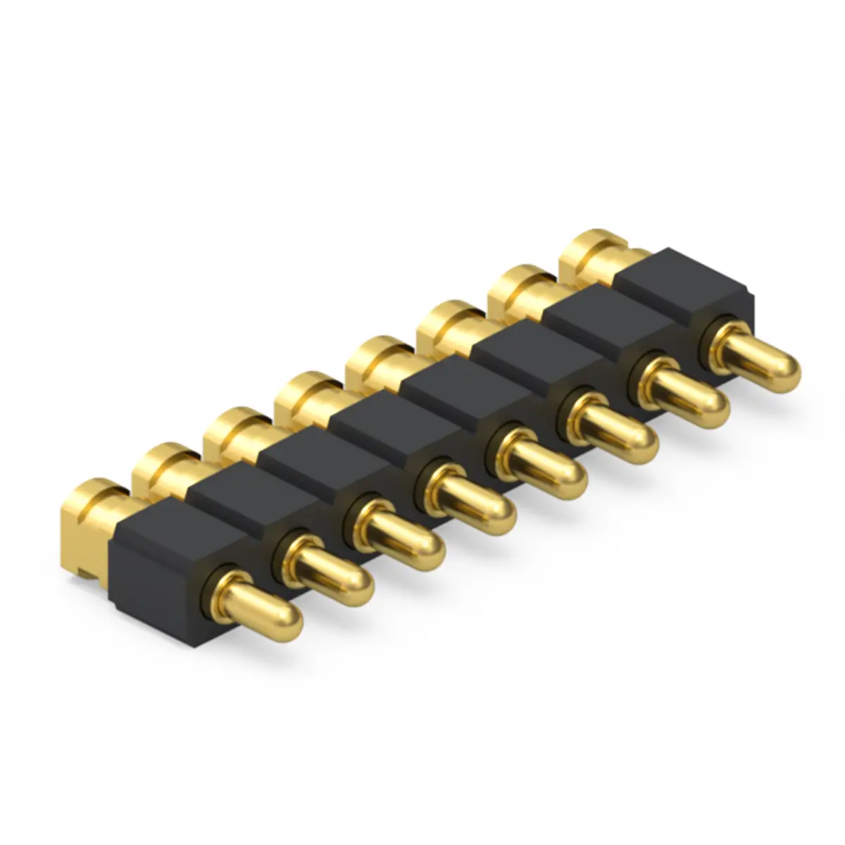 8 point pogo pin connector is a compact spring loaded contact module that integrates eight independent conductive pins in one body. Each pin has a sliding plunger inside a barrel with an internal spring, so connection happens through axial compression rather than rigid insertion. This structure helps the connector tolerate minor misalignment, vibration, and variation in stack height. It is widely used for charging docks, data interfaces, board to board connections, and test fixtures where frequent mating is required. The design supports quick engagement and reliable repeatability in compact products.
