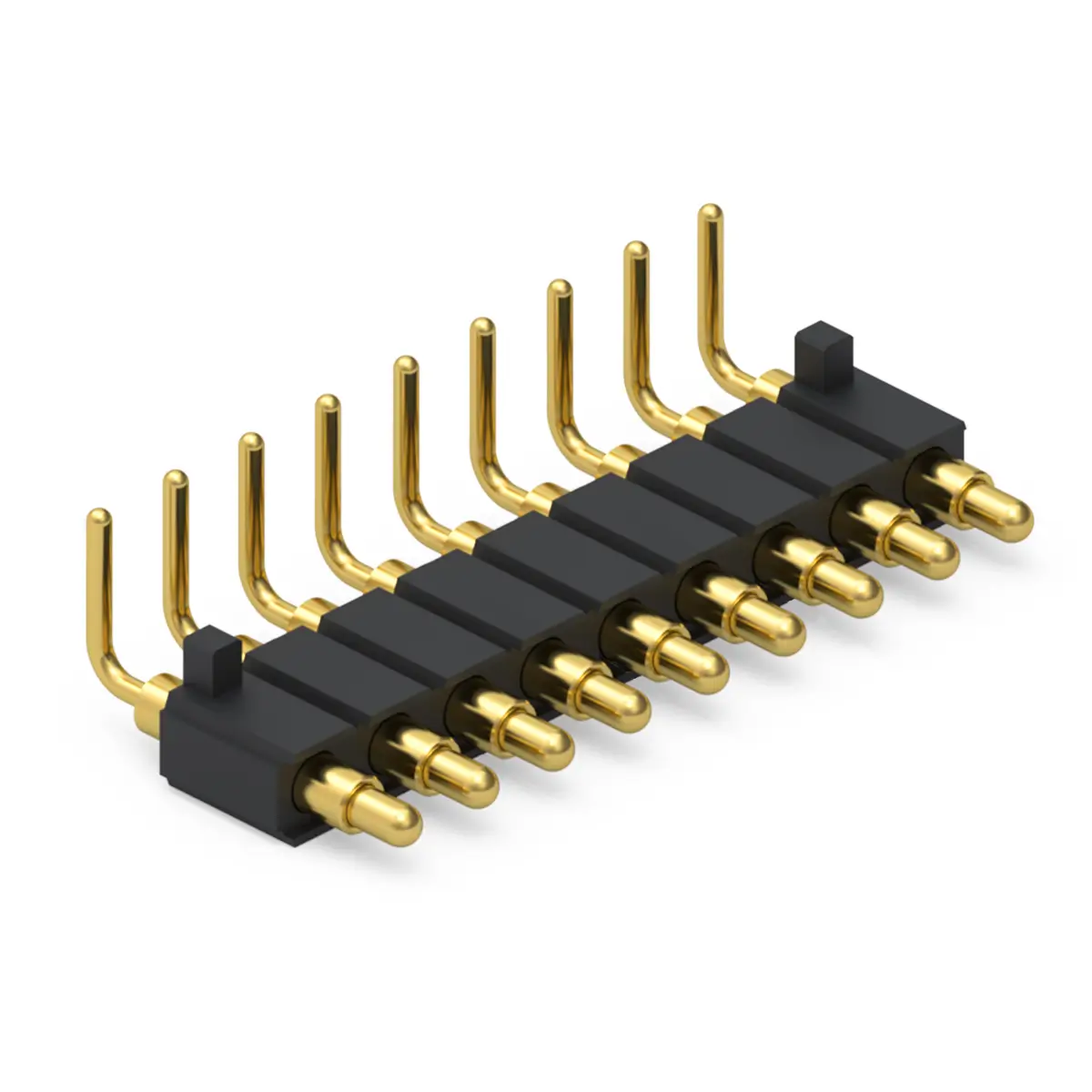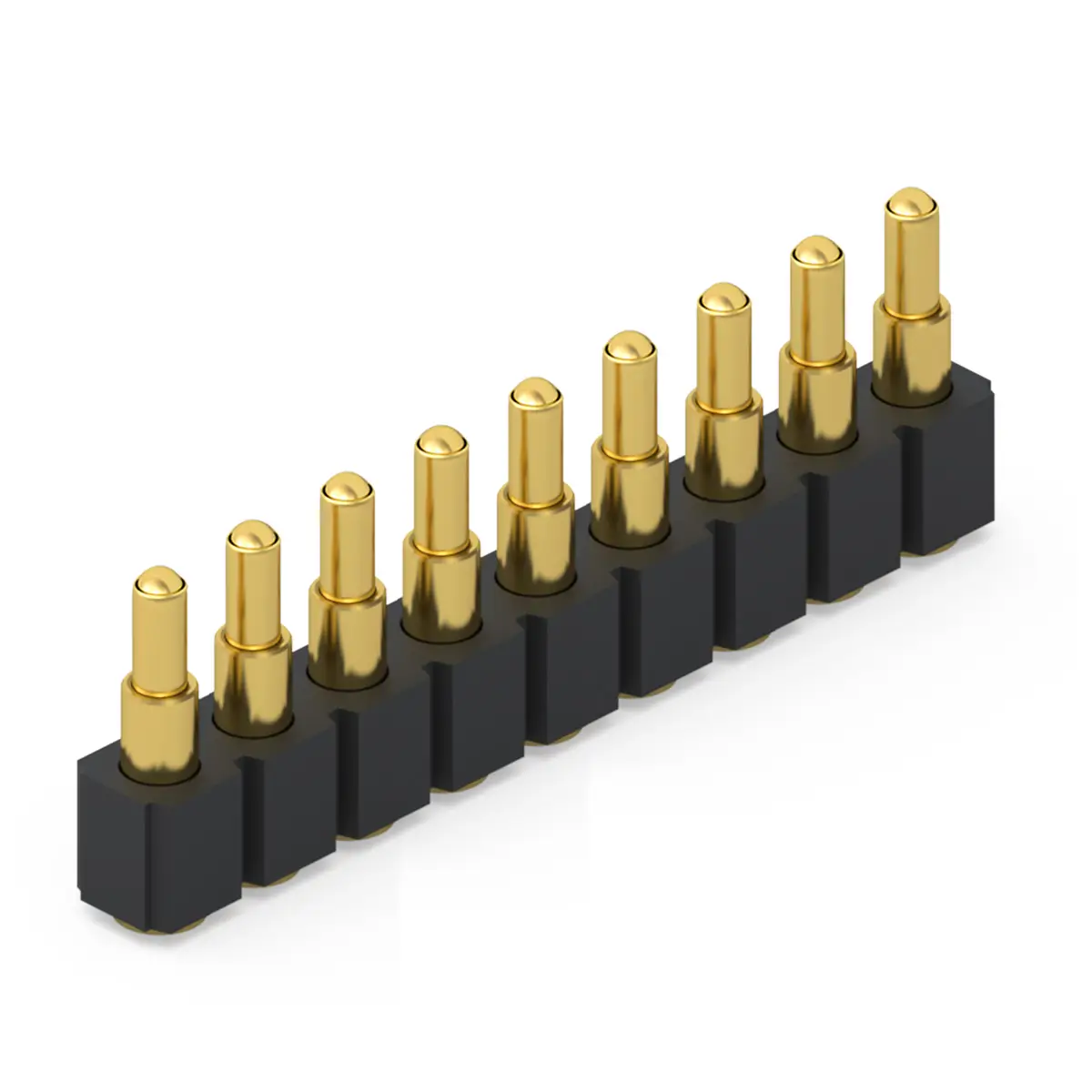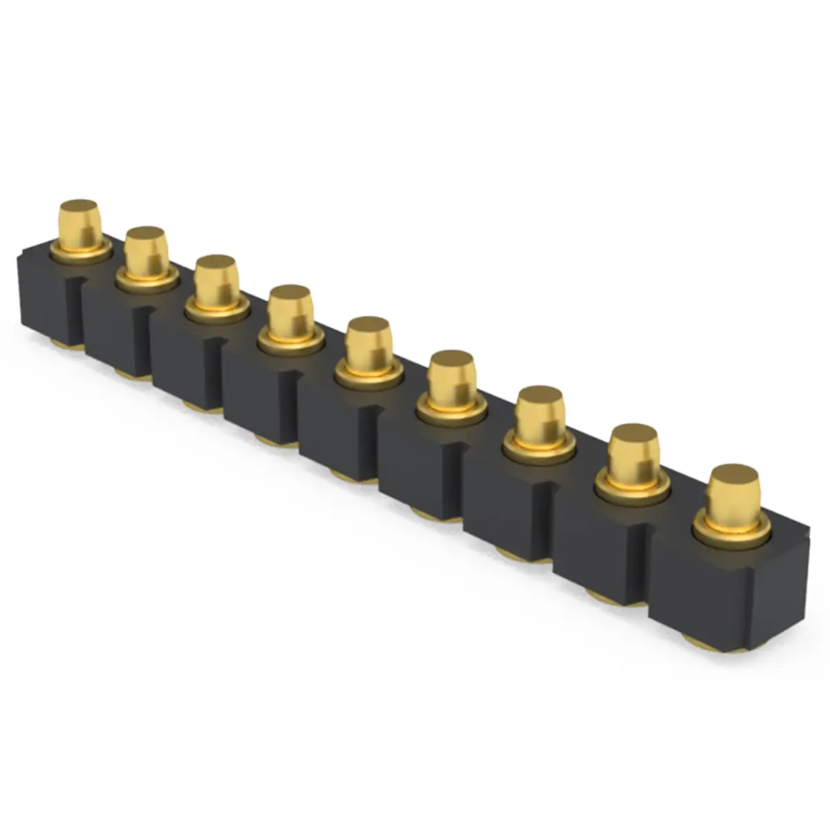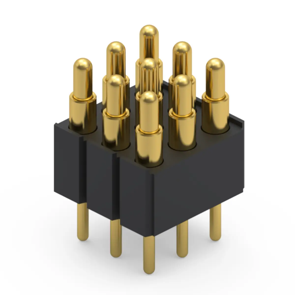 The 9 pin pogo connector consists of precision engineered parts manufactured from premium materials to guarantee longevity. Each pin assembly includes a plunger and barrel typically crafted from brass or copper alloys for superior conductivity. These components are plated with gold over nickel to prevent corrosion and reduce electrical resistance. The internal spring is usually made from stainless steel or music wire to provide consistent contact force. Additionally, a high temperature plastic housing, such as LCP or Nylon, holds the nine pins in perfect alignment while providing essential insulation and heat resistance during soldering.